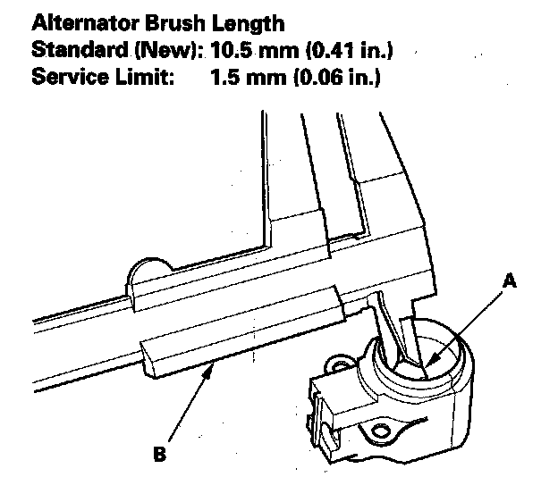 13. Measure the length of both brushes (A) with a vernier caliper (B).