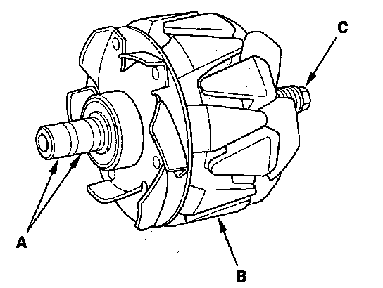 15. Check for continuity between each slip ring and the rotor (B) and the rotor shaft (C).