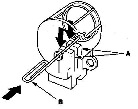 19. Push the brushes (A) in, then insert a pin or drill bit (B) (about 1.6 mm (0.06 in.) diameter) to hold them there.