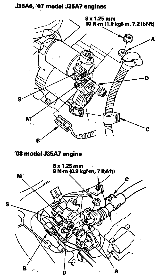 3. Remove the starter cable (A), S terminal connector (B), harness clamp (C), and motor cable (D).