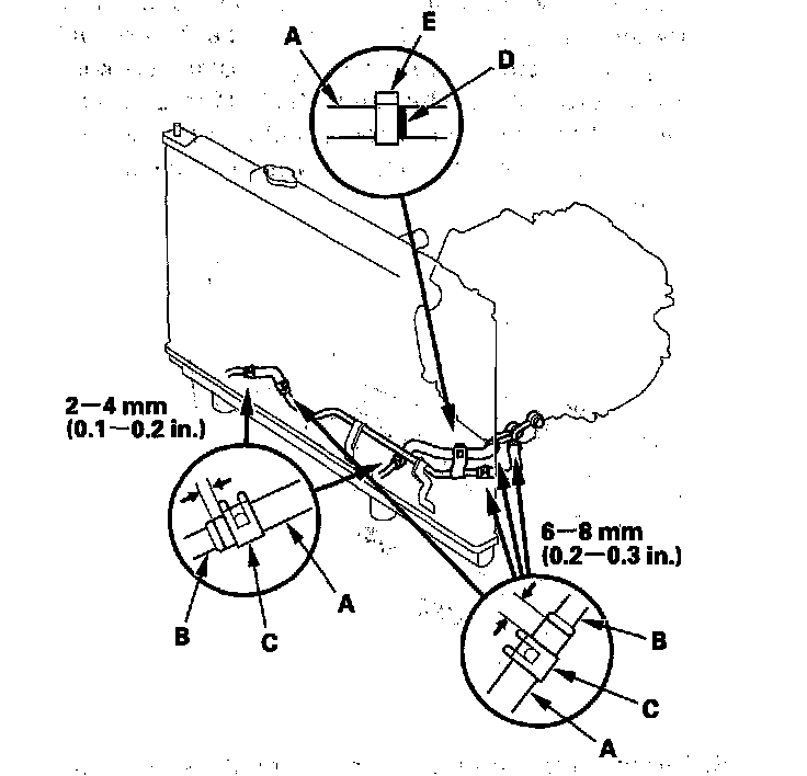 ATF Cooler Hose Replacement1. Connect the cooler hoses (A) to the ATF cooler lines (B) and the ATF cooler, and secure them with the clips (C).
