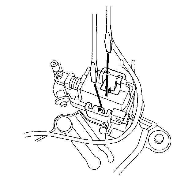 4. Release the lock tabs retaining the shift lock solenoid using the thin-bladed screwdrivers.