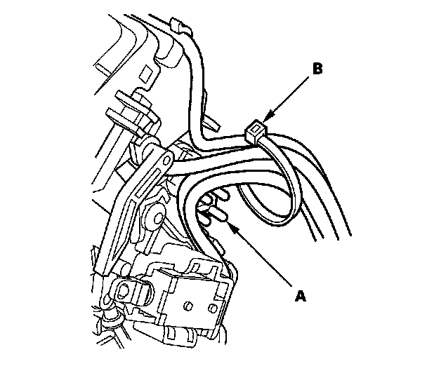 11. Route the harnesses along the harness guide (A), and tie the harnesses and guide with a new wire tie (B).