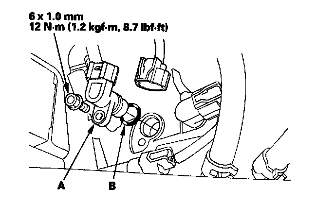 3. Install a new O-ring (B) on a new input shaft (mainshaft) speed sensor and apply clean ATF to the O-ring, then install the input shaft (mainshaft) speed sensor in the transmission housing.