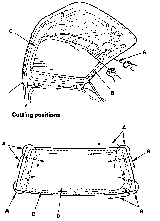 5. With a helper on the outside, pull the piano wire (A) back and forth in a sawing motion. Hold the piano wire as close to the rear window (B) as possible to prevent damage to the tailgate, and carefully cut through the adhesive (C) around the entire rear window.