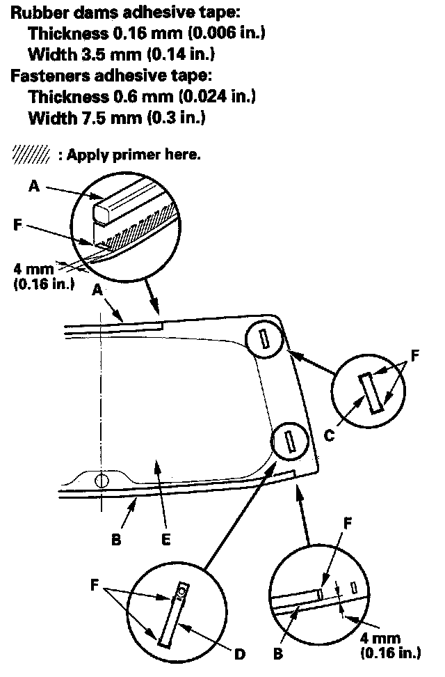 10. Attach the upper rubber dam (A), lower rubber dam (B), and fasteners (C, D) with adhesive tape to the inside face of the rear window (E) as shown. Before installing the upper rubber dams, apply primer to the area where the adhesive tapes will be applied to the inside face of the rear window: