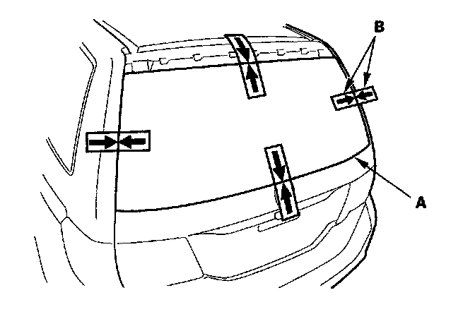 12. Set the rear window (A) in the opening, and center it. Make alignment marks (B) across the rear window and body with a grease pencil at the four points shown. Be careful not to touch the rear window where adhesive will be applied.