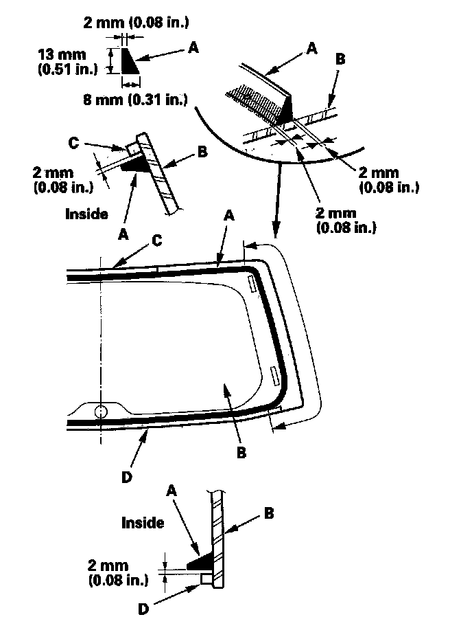 16. Put the cartridge in a caulking gun, and run a bead of adhesive (A) on the rear window (B) around the edge of the upper rubber dam (C) and lower rubber dam (D) as shown. Apply the adhesive within 30 minutes after applying the glass primer. Make a slightly thicker bead at each corner.