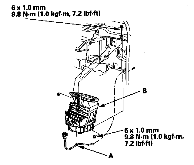 5. Remove the wire harness clip (A). Remove the mounting nuts, the mounting bolt, and the blower unit (B).