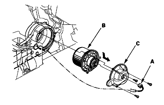 2. Disconnect the 2P connector (A) from the rear blower motor (B), then remove the self-tapping screws and the cover (C). Turn the rear blower motor clockwise to the stop, and remove it.