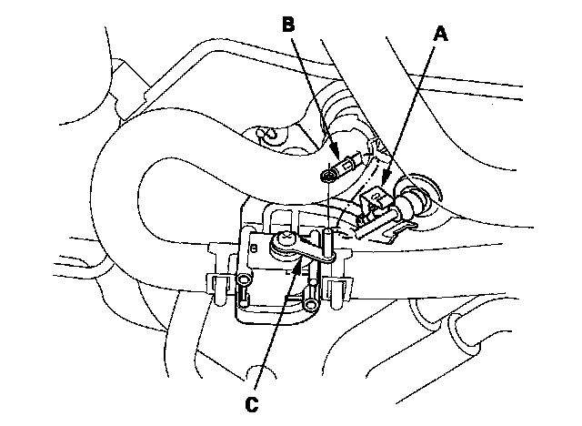 Heater Valve Cable Adjustment1. From under the hood, open the cable clamp (A), then disconnect the heater valve cable (B) from the heater valve arm (C).