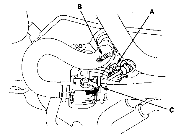 3. From under the hood, open the cable clamp (A), then disconnect the heater valve cable (B) from the heater valve arm (C). Turn the heater valve arm to the fully opened position as shown.