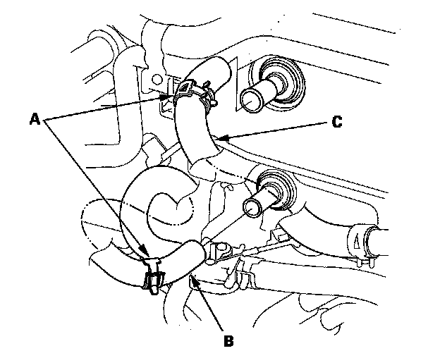 5. Slide the hose clamps (A) back, then disconnect the inlet heater hose (B) and the outlet heater hose (C) from the heater unit. Engine coolant will run out when the hoses are disconnected; drain it into a clean drip pan. Be sure not to let coolant spill on the electrical parts or the painted surfaces. If any coolant spills, rinse it off immediately.
