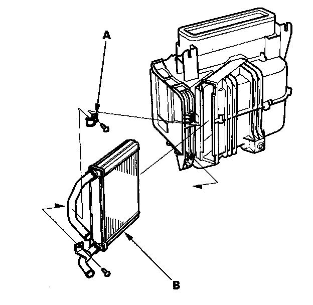 10. Remove the self-tapping screws and the clamp (A), then carefully pull out the heater core (B) so you don't bend the inlet and outlet pipes.