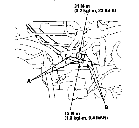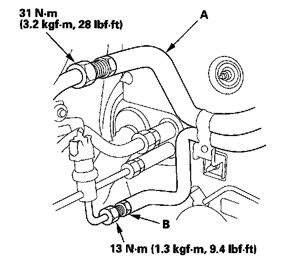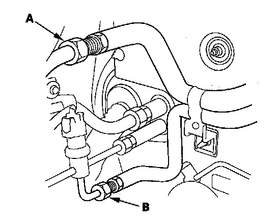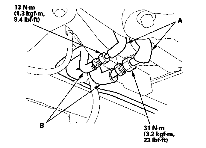 2. Route the upper replacement A/C lines along the engine compartment bulkhead, and loosely connect the upper lines (A) to the lower lines (B). Do not tighten the connections yet.