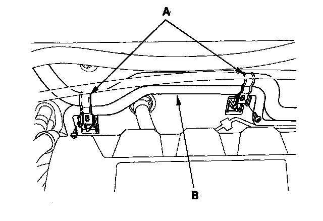 3. Remove the screws from the two clamps (A) along the engine compartment bulkhead, then free the rear A/C lines (B) from the clamps.
