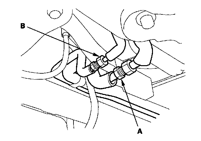 2. Disconnect the rear A/C suction line (A) and receiver line (B) at the front evaporator.