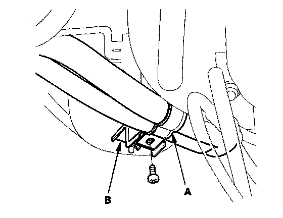3. Install the A/C line clamp (A) on the lower replacement A/C line. Slide the bracket onto its A/C line bracket (B), but do not install the screw yet.