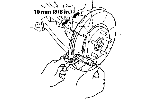 6. Set up the dial gauge against the brake disc as shown, and measure the runout at 10 mm (3/8 in.) from the outer edge of the brake disc.