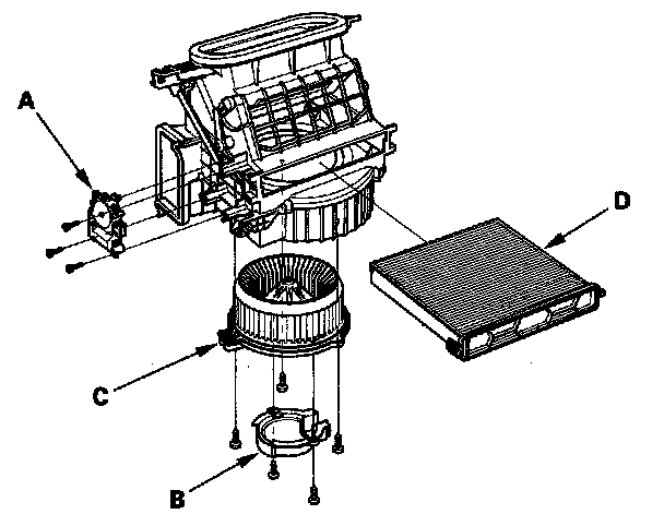 - The recirculation control motor (A), the blower motor cover (B), blower motor (C), and the dust and pollen filter (D) can be replaced without removing the blower unit.