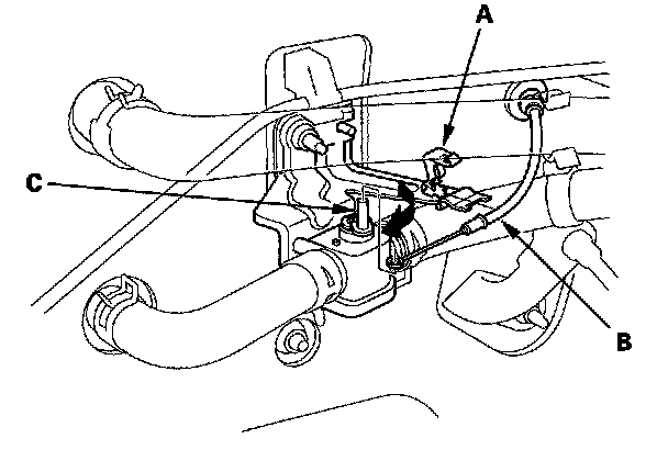 4. From under the hood, open the cable clamp (A), then disconnect the heater valve cable (B) from the heater valve arm (C). Turn the heater valve arm to the fully opened position as shown.