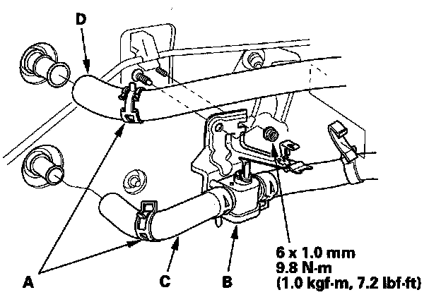 6. Slide the hose clamps (A) back. Remove the nut and the water valve (B), then disconnect the inlet heater hose (C) and the outlet heater hose (D) from the heater unit. Engine coolant will run out when the hoses are disconnected; drain it into a clean drip pan. Be sure not to let coolant spill on the electrical parts or the painted surfaces. If any coolant spills, rinse it off immediately.