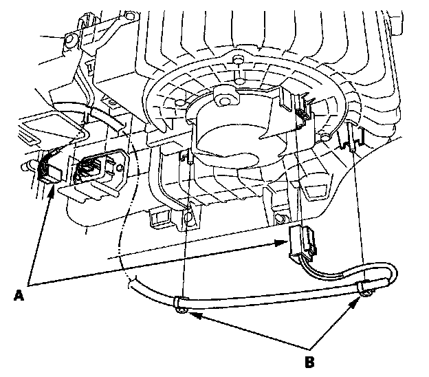 9. Disconnect the connectors (A) from the blower motor and the power transistor, then remove the wire harness clips (B).