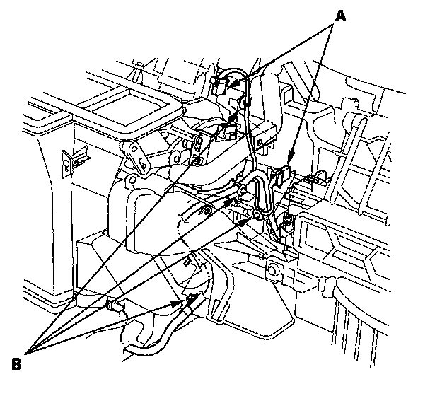 10. Disconnect the connectors (A) from the mode control motor and the recirculation control motor, then remove the wire harness clips (B).