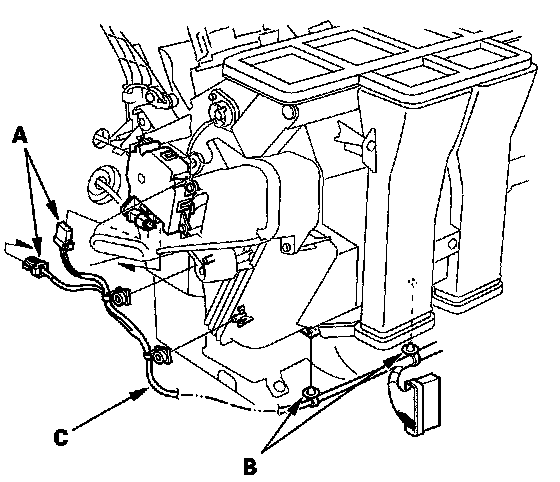 11. Disconnect the connectors (A) from the evaporator sensor and the air mix control motor, then remove the wire harness clips (B) and the wire harness (C).
