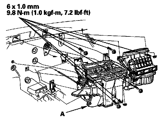 12. Remove the mounting nuts and the blower-heater unit (A).