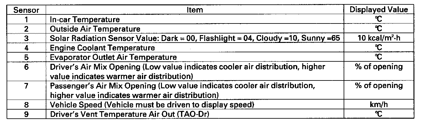 Displaying Sensor Inputs at the Climate Control UnitThe climate control unit has a mode that displays sensor inputs it receives. This mode shows you what the climate control unit is receiving from each of the sensors, one at a time, and it can help you determine if a sensor is faulty.