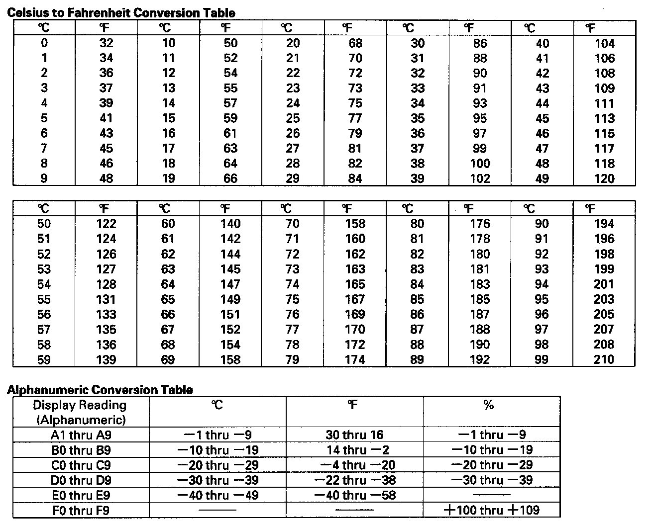 - The sensor values will be displayed in degrees Celsius (°C) or an alphanumeric code. Use the chart to convert the value to degrees Fahrenheit (°F).