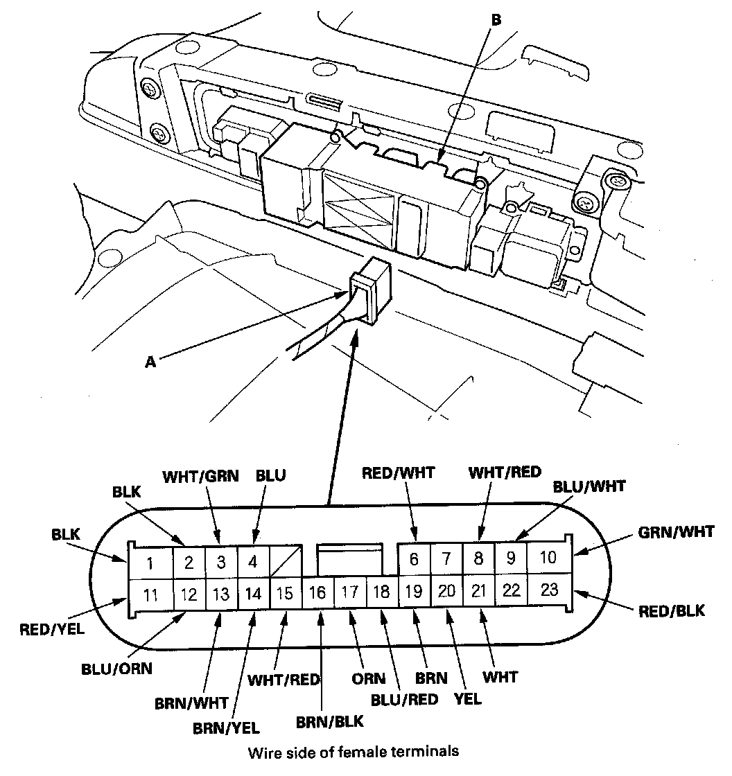 4. Disconnect the 23P connector (A) from the power window master switch (B).