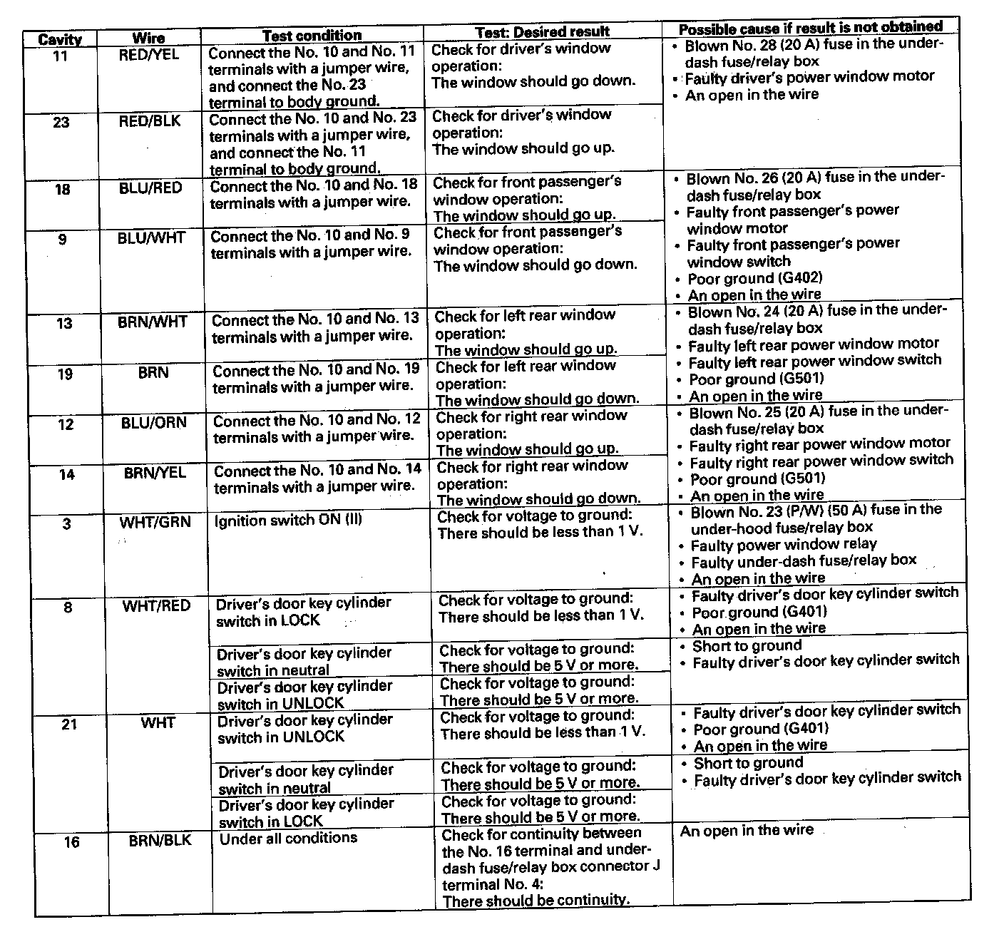 7. Reconnect the connector to the power window master switch, turn the ignition switch ON (II) and make these input tests at the connector.