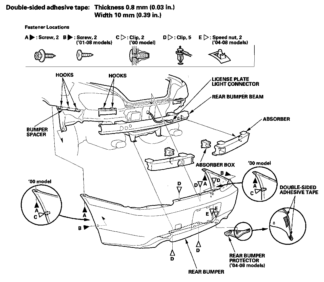 1. Remove the rear bumper as shown. For '04-08 models, to release the speed nuts, refer to front grille replacement.