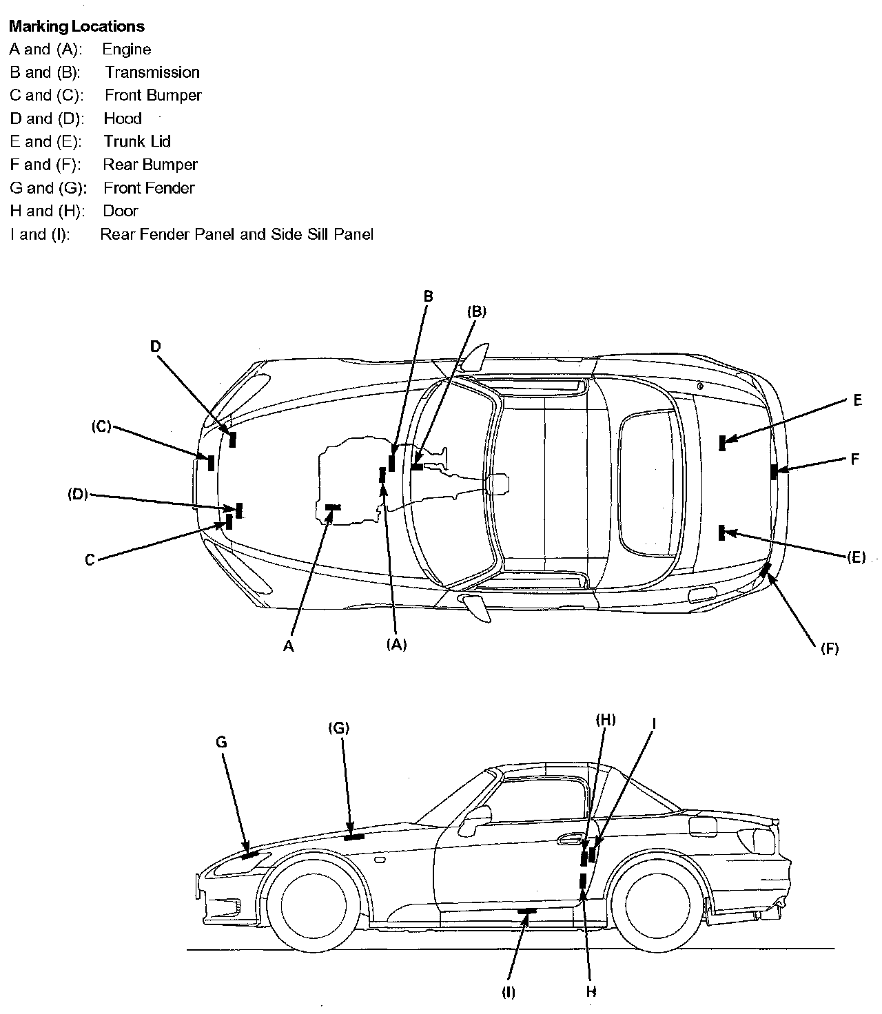 Parts Marking LocationsTo deter vehicle theft, certain major components are marked with the vehicle identification number (VIN). Original parts have self-adhesive labels. Replacement body parts will have self-adhesive labels, and replacement engine and transmission will have the VIN plate attached with a break-off bolt.
