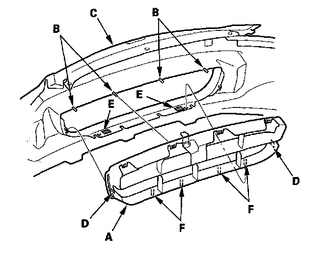 4. Pull the top edge of the grille (A) out to release the pins (B) of the front bumper (C), and then release the tabs (D) on both sides, and release the double-sided adhesive tape (E) and pins (F), then remove the grille from the bumper.