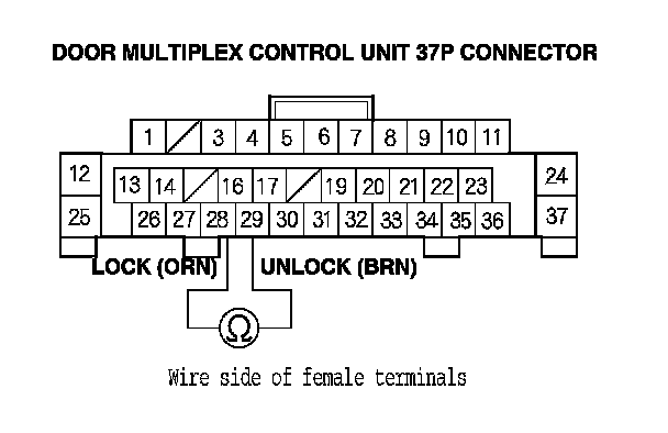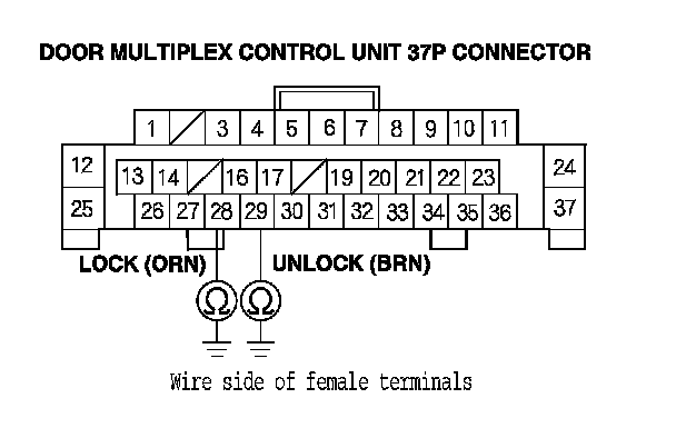15. Check for continuity between the door multiplex control unit 37P connector terminals No. 28 and No. 29.
