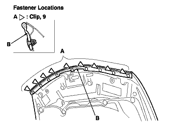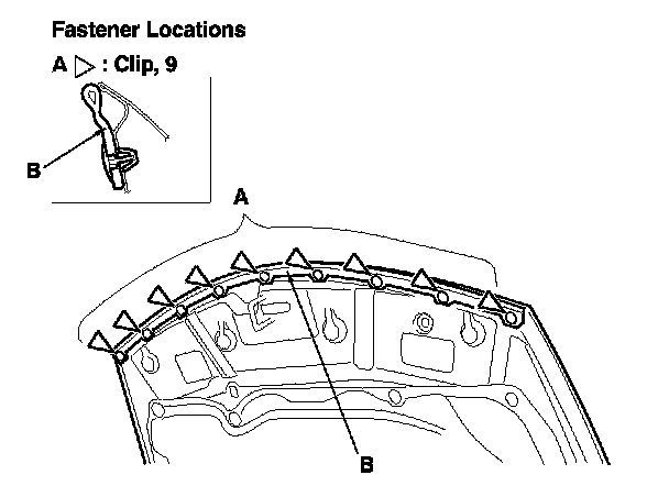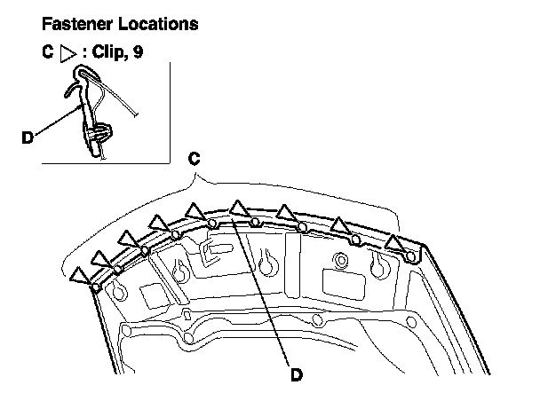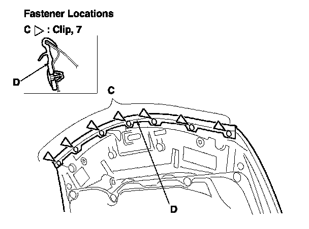 1. Using a clip remover, detach the clips (A), then remove the hood seal (B). On Canada models: Detach the clips (C), then remove the hood molding (D). Take care not to scratch the hood.