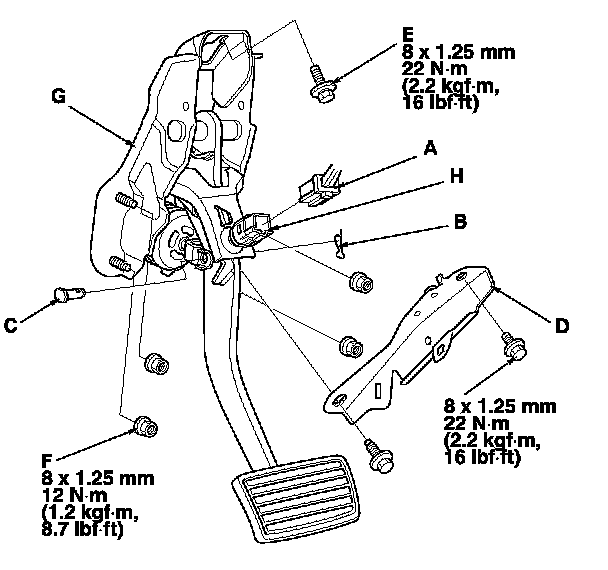 4. Remove the brake pedal bracket mounting bolt (E) and nuts (F).