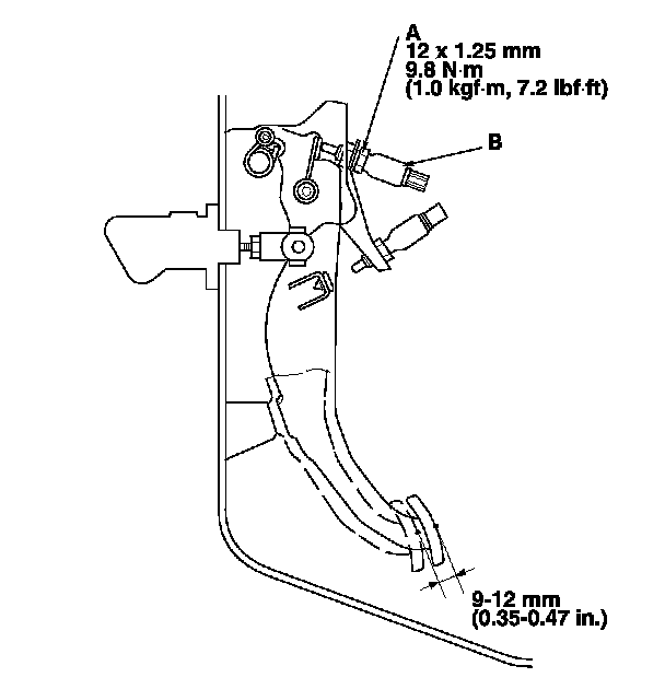 5. With the clutch pedal released, turn in the clutch pedal position switch (B) until it contacts the clutch pedal.