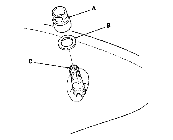 6. Remove the valve stem nut (A) and the washer (B), then remove the tire pressure sensor with the valve stem (C) from the wheel.