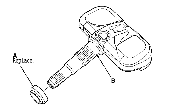 7. Remove and discard the valve stem grommet (A) from the tire pressure sensor (B).