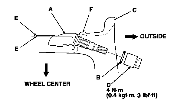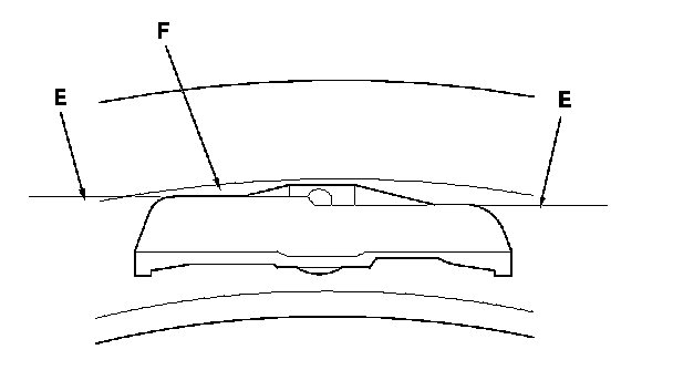 NOTE: Install the tire pressure sensor so that the sensor housing surface (E) does not extend beyond the protrusion (F) on the wheel to prevent the sensor housing from being caught on the bead of the tire when assembling the tire.