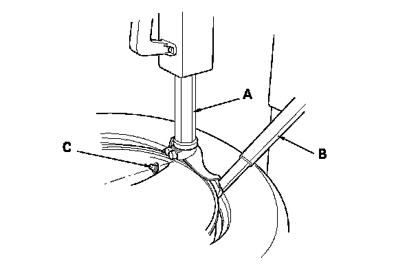 5. Position the wheel so the tire machine (A) and tire iron (B) are next to the valve stem (C) and will move away from it when the machine starts. Then remove the tire from the wheel.