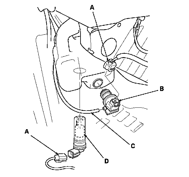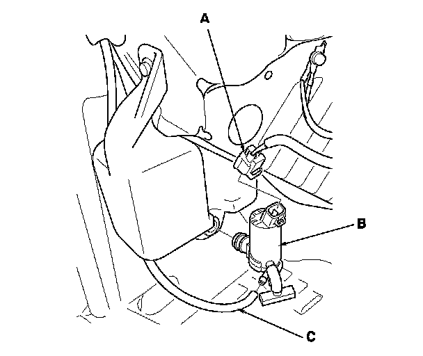 3. Disconnect the washer tube (C), then if necessary, remove the washer motor and the washer fluid level switch (D) (Canada models).