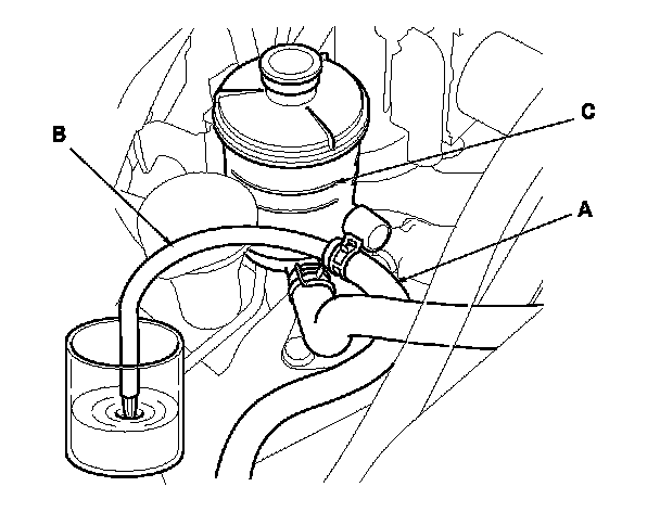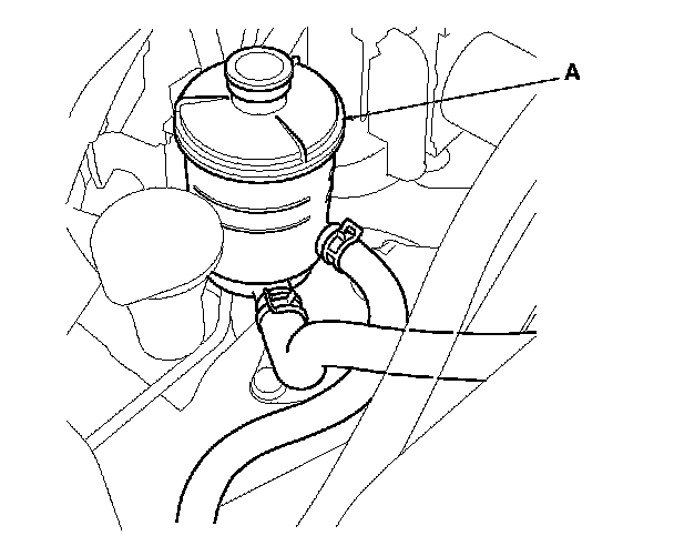 1. Remove the reservoir from its holder. Raise the reservoir, then disconnect the return hose (A) to drain the reservoir. Take care not to spill the fluid on the vehicle. Wipe off any spilled fluid at once.
