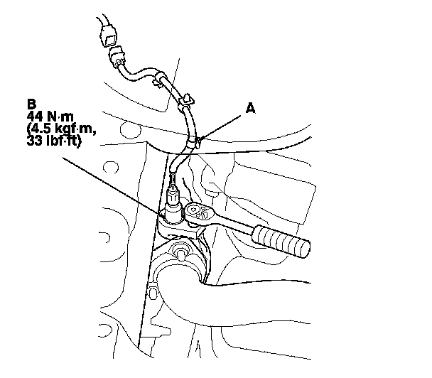 1. Disconnect the front secondary HO2S 4P connector (A), and remove the harness clamps (B).