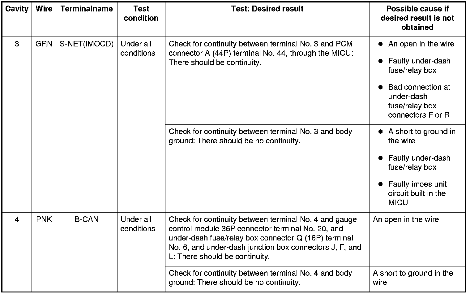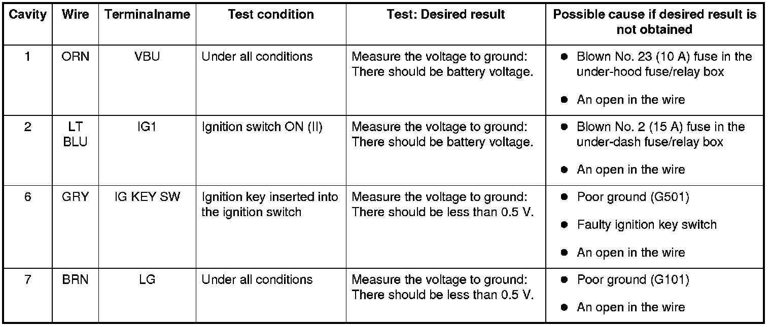 NOTE: Before testing, troubleshoot the multiplex integrated control unit first, using B-CAN System Diagnosis Test Mode A Troubleshooting - B-CAN System Diagnosis Test Mode A, and check the No. 23 (10 A) fuse in the under-hood fuse/relay box and the No. 2 (15 A) fuse in the under-dash fuse/relay box.