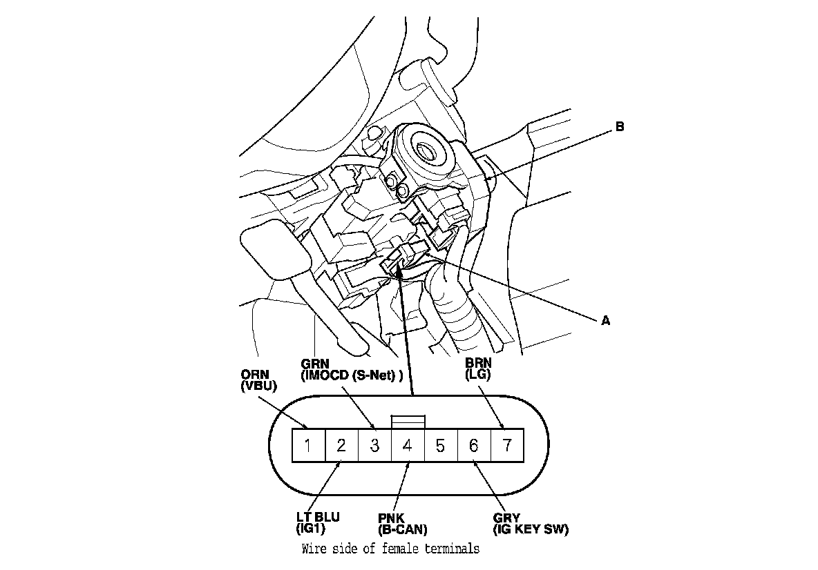 3. Disconnect the 7P connector (A) from the immobilizer-keyless control unit (B).
